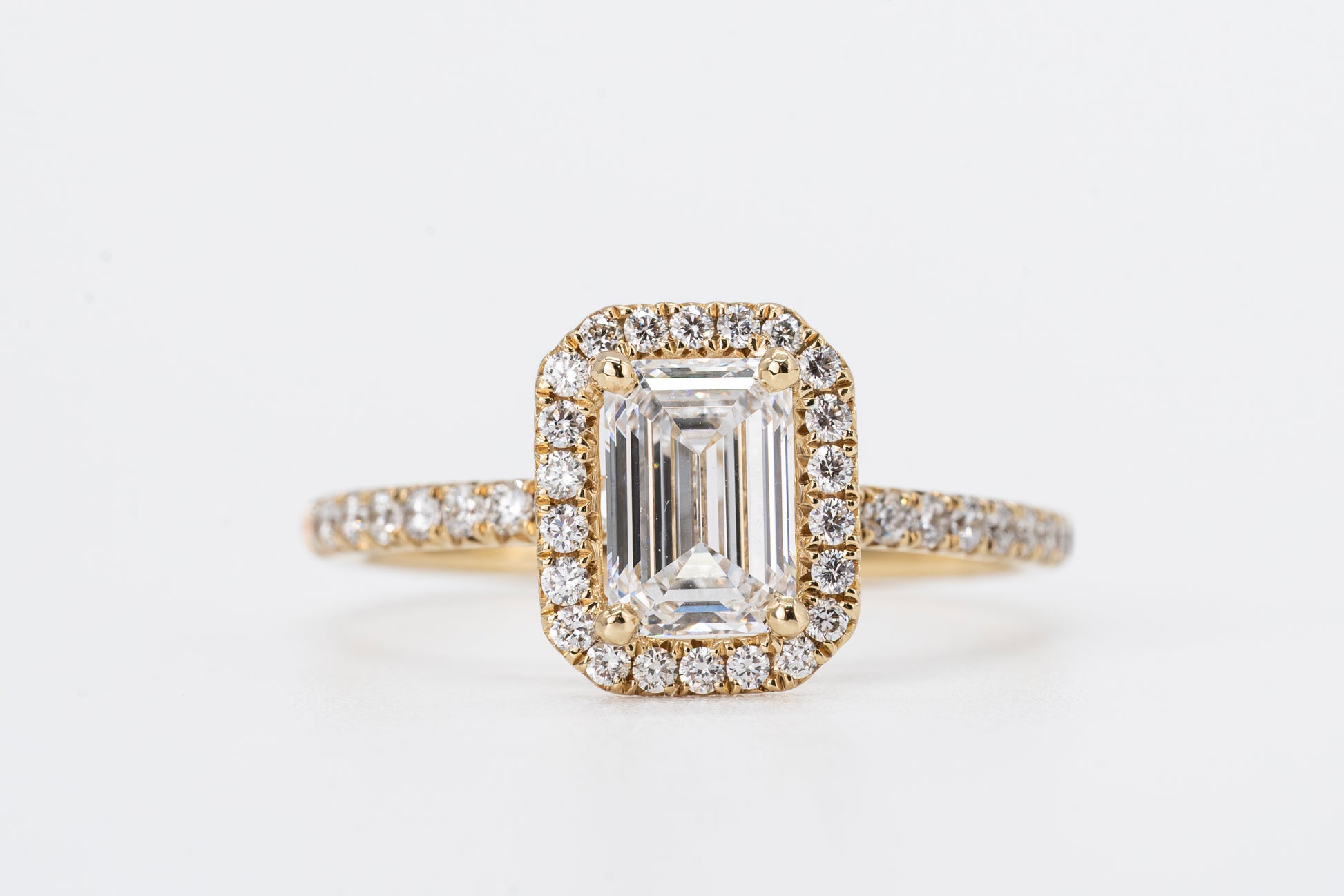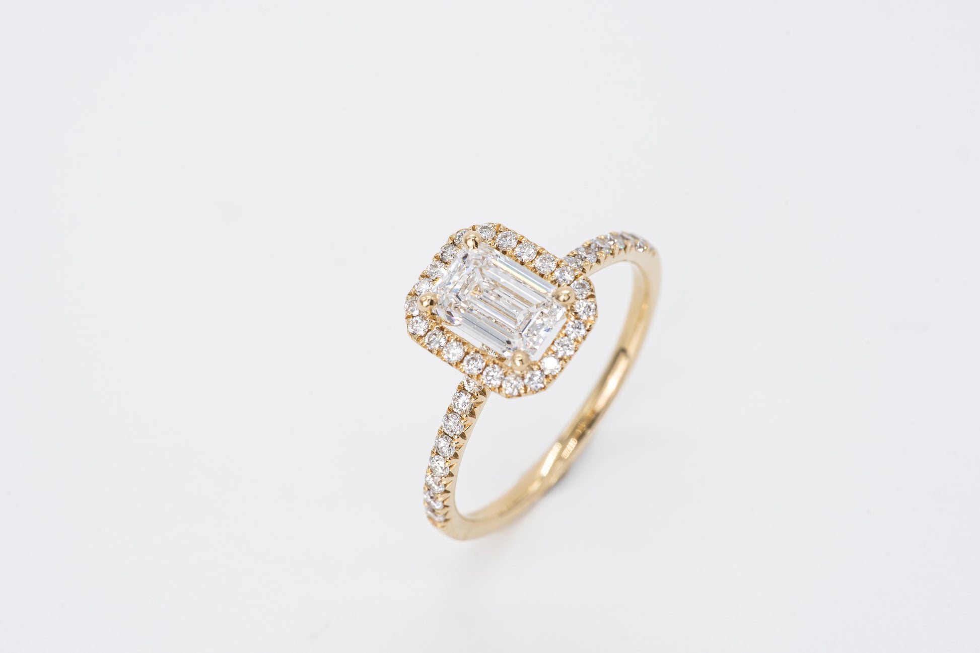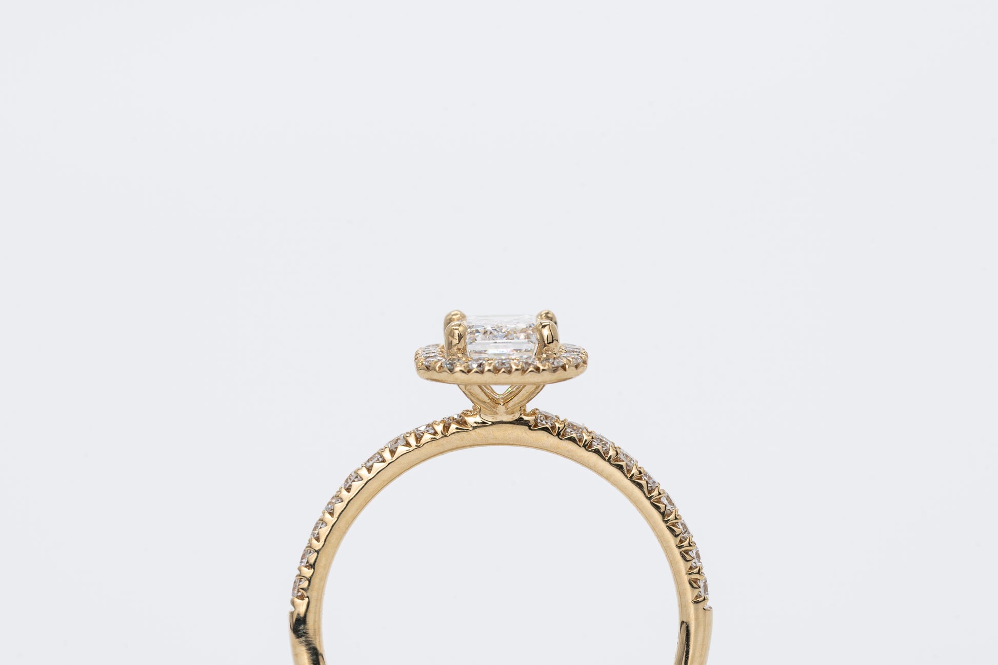 AURELINE - 18CT Yellow Gold, Emerald Cut Halo Ring