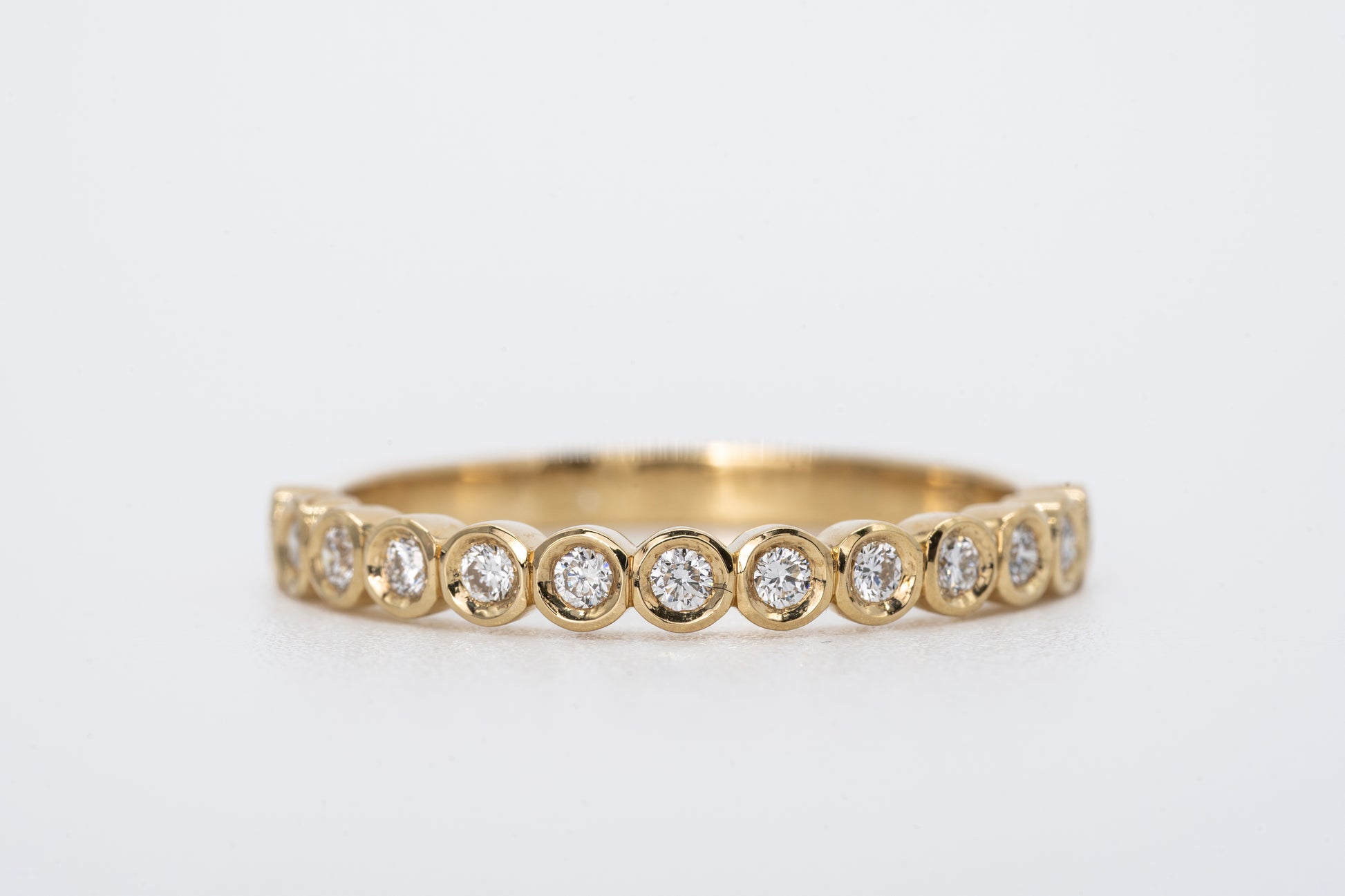 Understated yet luminous, The Celine celebrates simplicity and balance. Crafted in 18CT white gold, this band features 13 bezel-set natural diamonds that create a continuous shimmer—perfect worn alone or layered alongside engagement and statement rings.