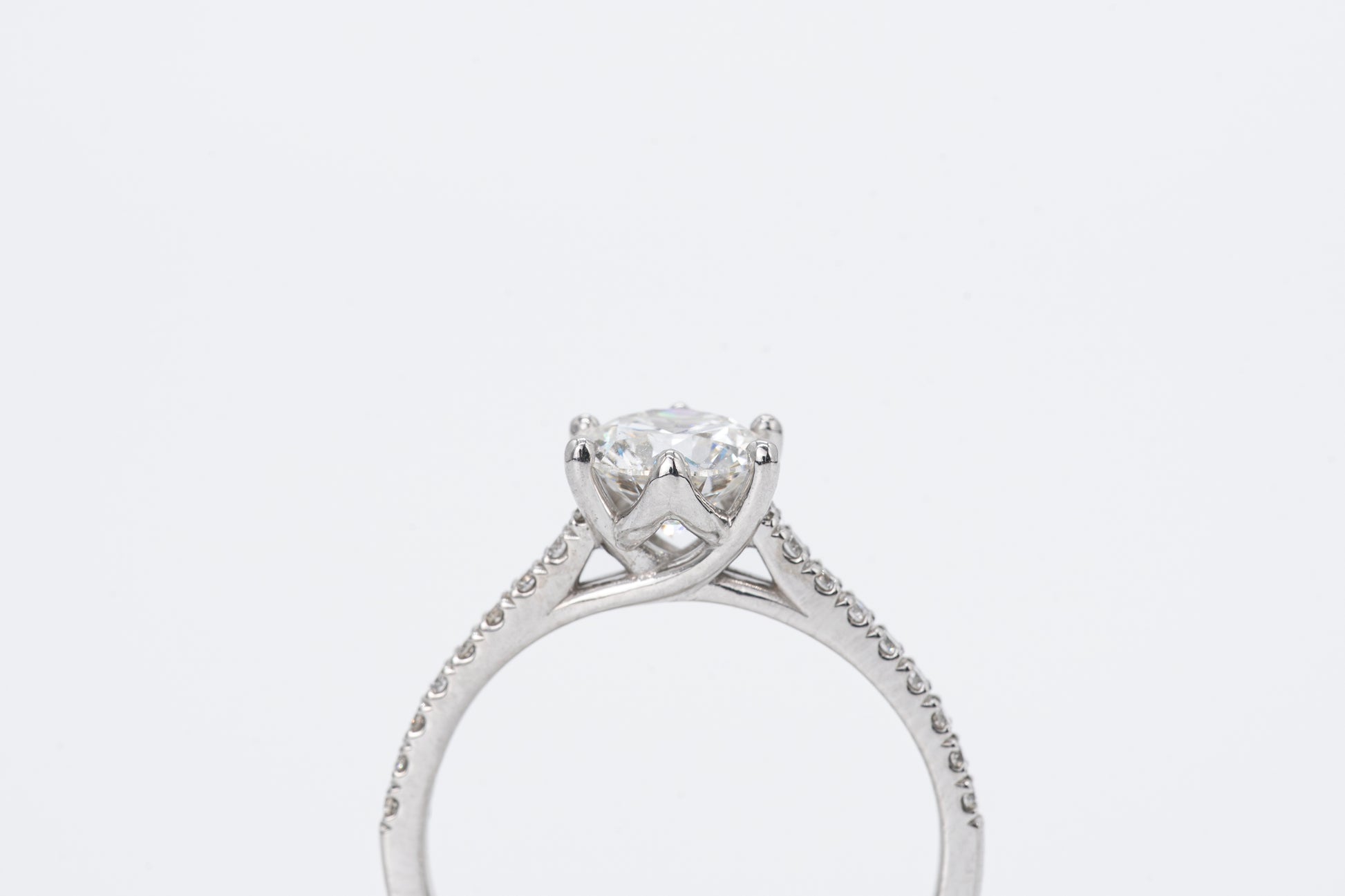 Crafted in 18CT white gold, The Elara showcases a radiant 1.12CT lab-grown diamond set in a six-prong setting, lifted by a band of natural accent stones that add just the right touch of shimmer. Its delicate pavé shoulders draw the eye toward the centre stone, symbolising focus, devotion, and enduring love.