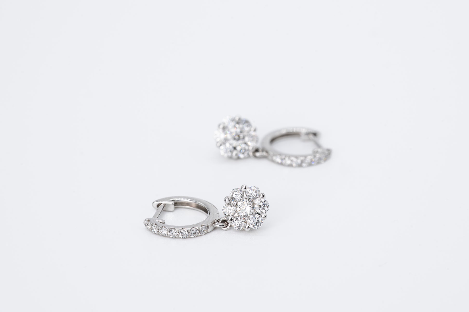 Timeless radiance with a modern silhouette—The Estelle features a halo of diamonds suspended from sleek 18CT white gold hoops. Each stone catches the light in motion, creating a refined sparkle that feels both classic and contemporary.