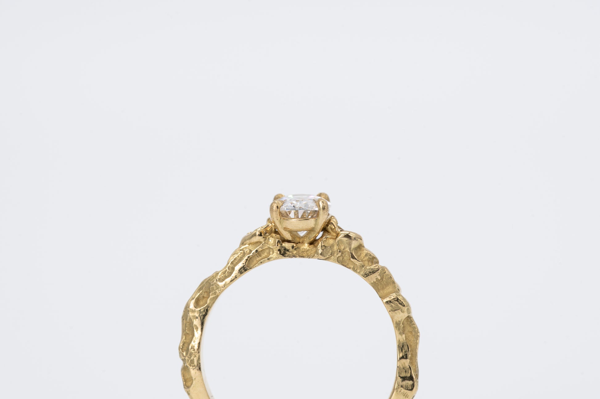 Commanding yet deeply romantic, The Aurelia captures the beauty of imperfection through hand-engraved, organic 18CT yellow gold. Centred with a 1.08CT lab-grown diamond and framed by two accent stones, it’s a modern emblem of strength, artistry, and grace.