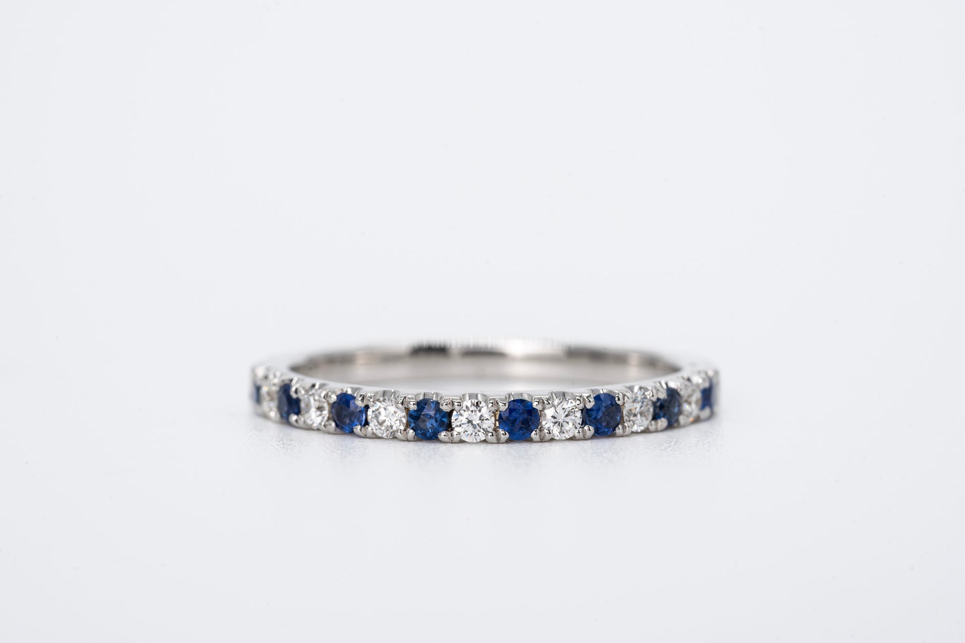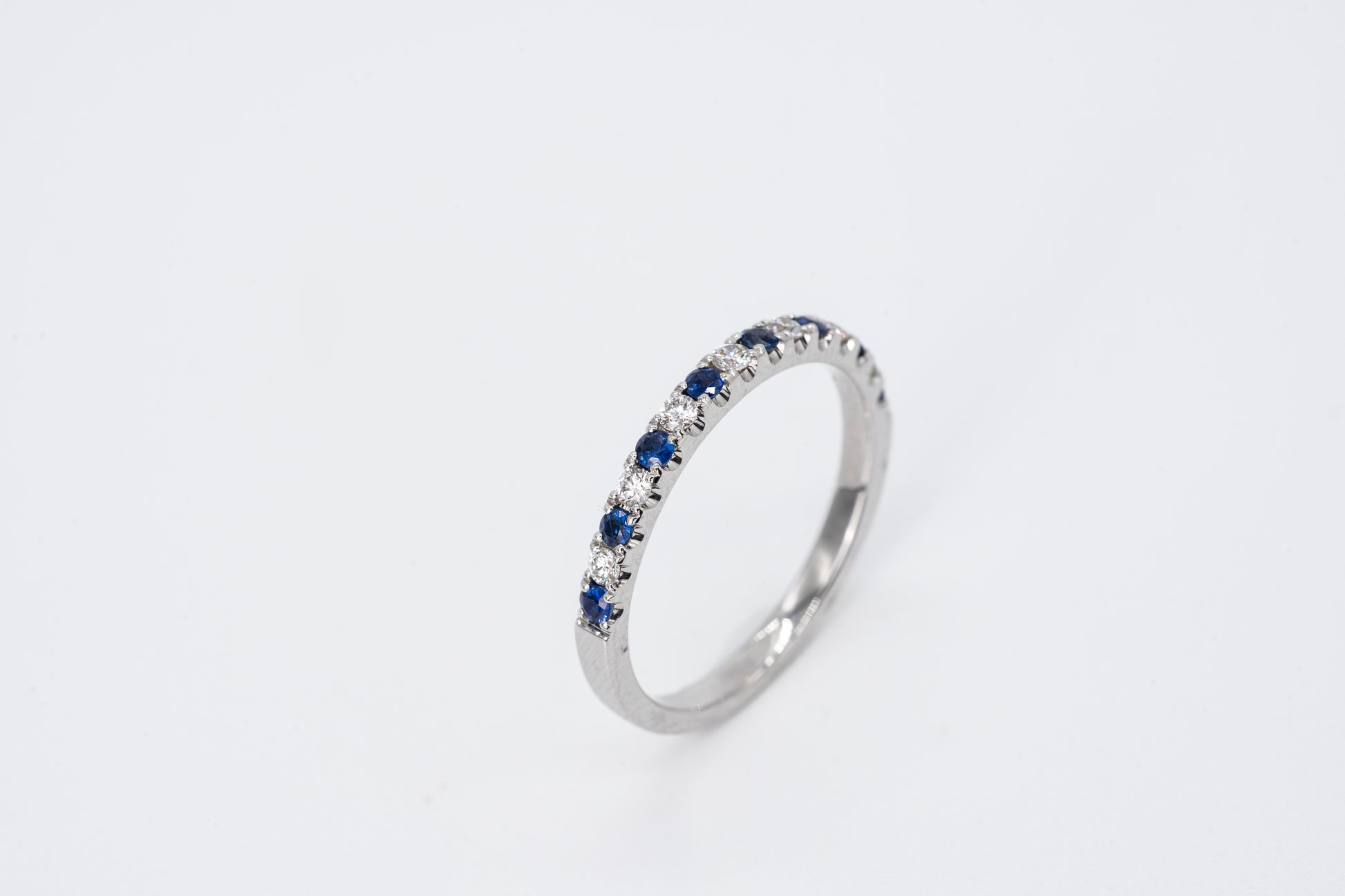 Crafted in 18CT white gold, The Selene ring features an alternating band of vivid blue sapphires and natural diamonds — a timeless combination that evokes both elegance and strength. With eight sapphires (0.22CT) and seven diamonds (0.17CT), its refined symmetry and delicate band make it ideal as a stackable piece or a standalone statement of grace.