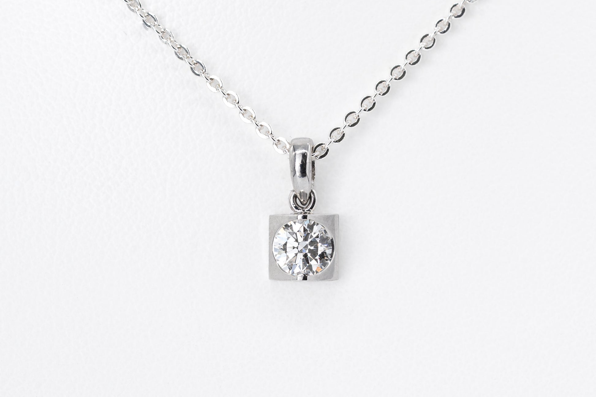 The Solenne pendant features a single 0.50CT lab-grown round diamond, precision-set in sleek 18CT white gold. Its geometric square framing offers a modern edge, letting the diamond’s brilliance take centre stage.