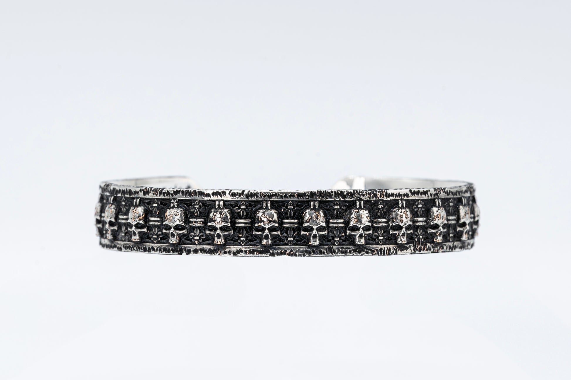 Crafted in solid sterling silver and detailed with engraved skulls, this open bracelet carries weight, presence, and unmistakable edge. Subtle flecks of 14K yellow gold break through the silver surface, adding warmth and contrast to its bold design.