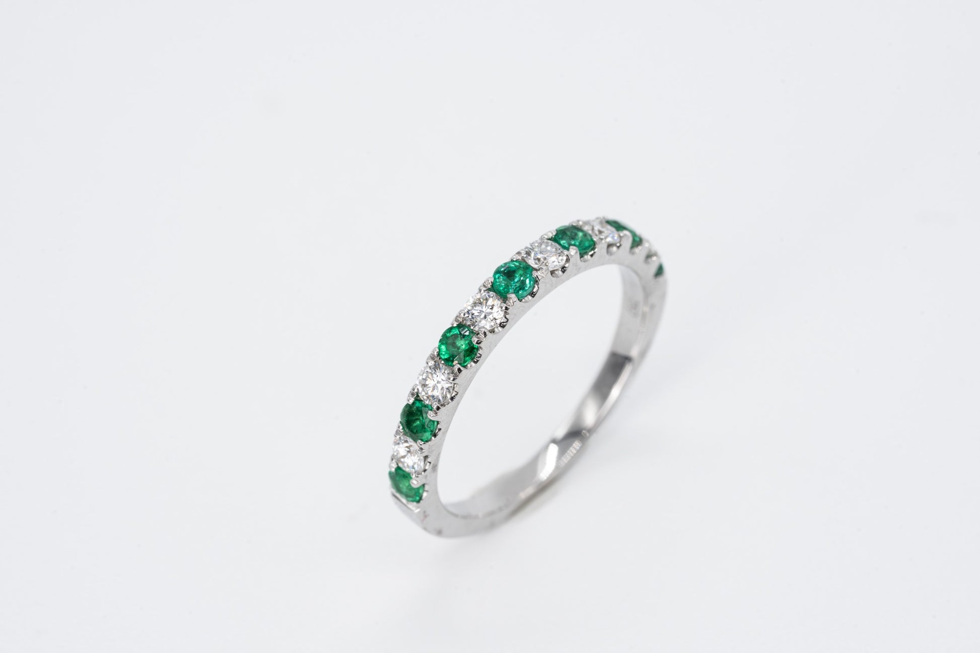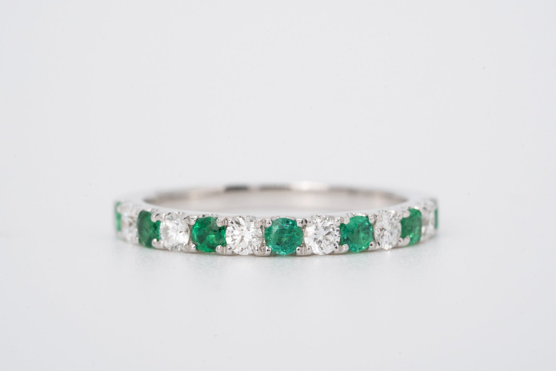 Handcrafted in 18CT white gold, The Valera ring pairs the deep green allure of natural emeralds with the refined sparkle of brilliant-cut diamonds. With alternating stones — seven emeralds (0.37CT) and six diamonds (0.31CT) — this half-eternity design captures the perfect harmony of colour and light.